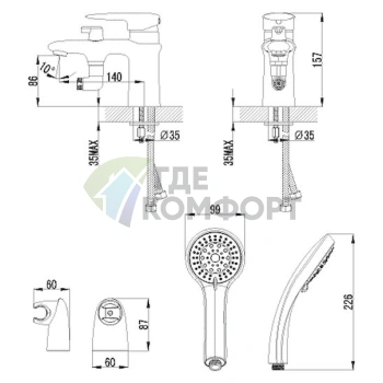 Оснащение: душевой шланг, душевая лейка, дивертор, настенный держатель, эксцентрики, аэратор