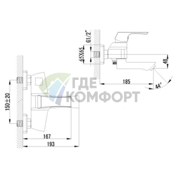 Оснащение: душевой шланг, душевая лейка, настенный держатель, эксцентрики