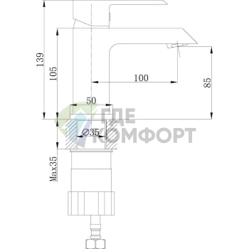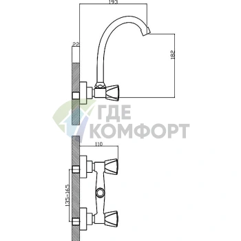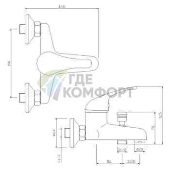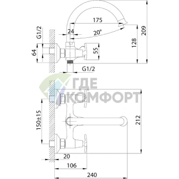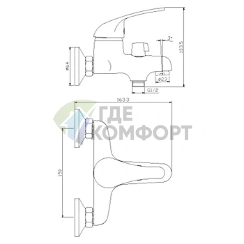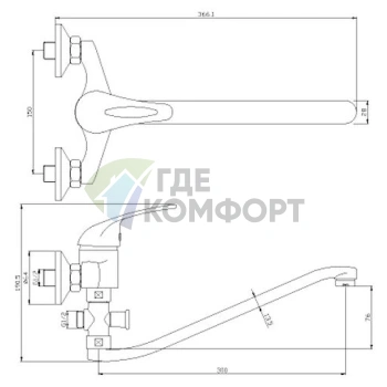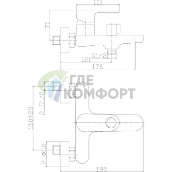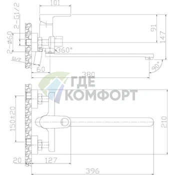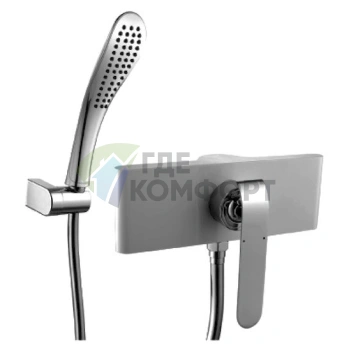 Оснащение: душевой шланг, душевая лейка, дивертор, настенный держатель, эксцентрики, аэратор