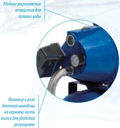 - Встроенная автоматика: реле давления и манометр для контроля и регулировки работы системы.