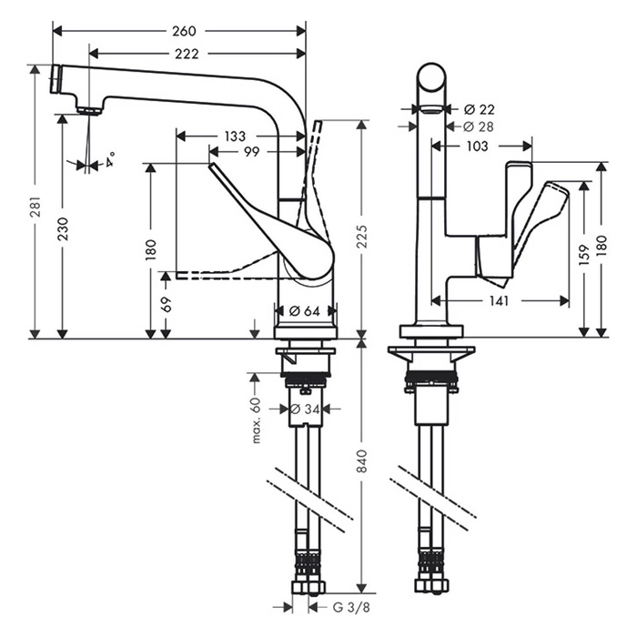 Высота и вылет излива в 222 мм - оптимальны для большинства моек. Это позволяет без проблем мыть крупные кастрюли и наполнять высокие кувшины. Проверьте перед установкой, чтобы излив доставал до всех углов вашей раковины, особенно если она двойная или нестандартной формы.