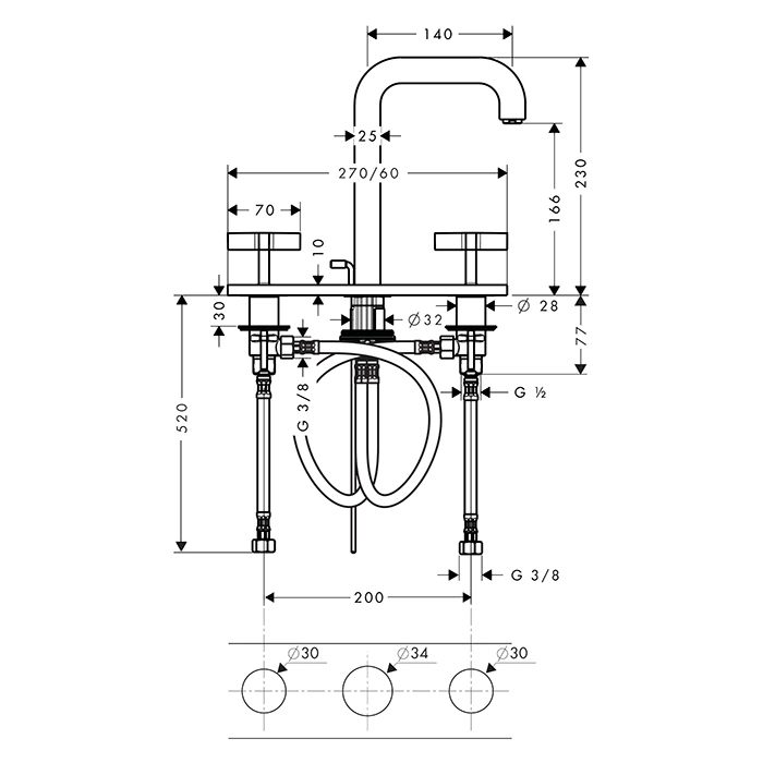 - Универсальное крепление позволяет установить смеситель на раковину или столешницу с одним или тремя монтажными отверстиями.