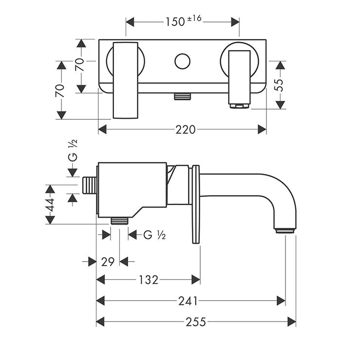 Данная модель представляет собой настенный смеситель для ванны. Он монтируется на стену или вертикальную панель с помощью стандартного крепления. Для установки требуются два вывода подводки воды, расположенные на стандартном расстоянии (межосевое расстояние 150 мм).