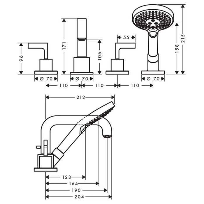 Смеситель для ванны AX Citterio на 4 отверстия с ручным душем и рычажными рукоятками