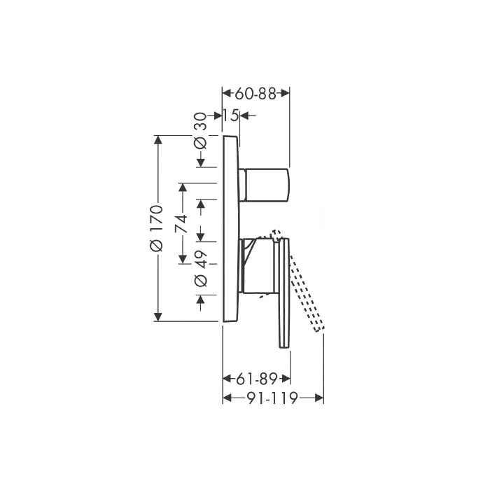Это встраиваемый (скрытого монтажа) смеситель. Его монтажная панель устанавливается в подготовленное отверстие в стене или в конструкции. Межосевое расстояние для подключения к водопроводу составляет стандартные 150 мм. Перед покупкой необходимо убедиться в возможности скрытого монтажа и подготовке ниши.