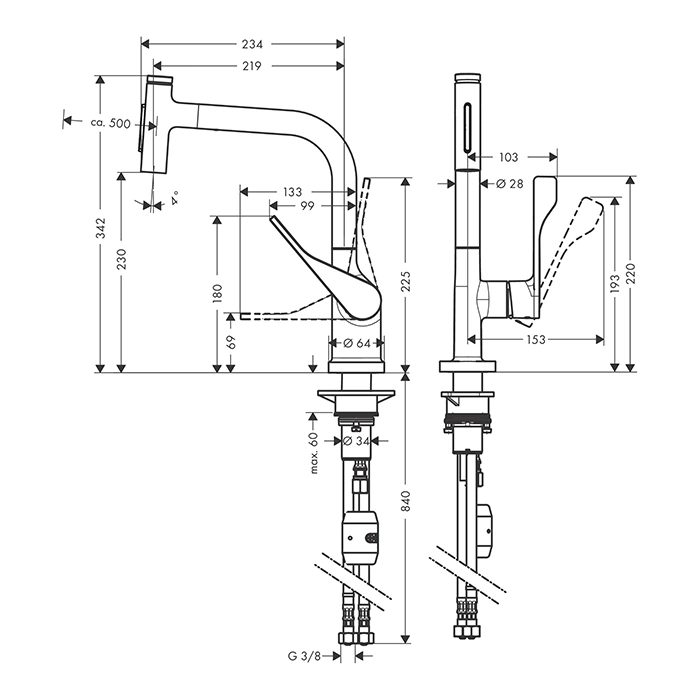 При выборе смесителя с вытяжным изливом, подобного AX Citterio, в первую очередь оцените длину гибкого шланга. Для комфортного использования мойки, особенно двухчашевой, минимальная рекомендуемая длина - 80 см. Проверьте, заявлена ли эта характеристика в описании товара.