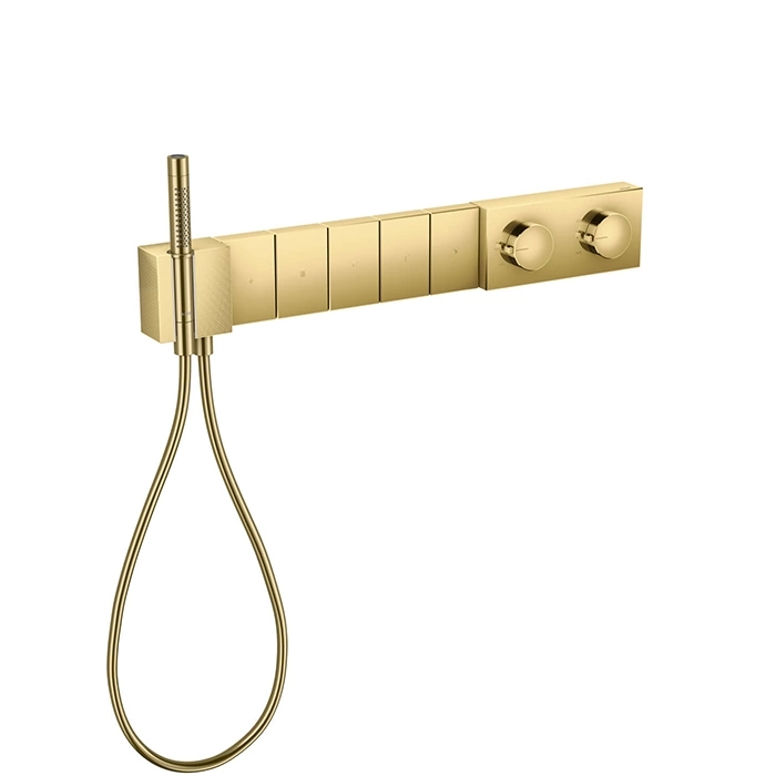 В базовый комплект, как правило, входят: встраиваемый термостатический модуль (корпус), лицевая панель с рукояткой управления, ручной душ с шлангом и крепежные элементы. Дополнительные аксессуары, такие как настенная держалка для душа, могут поставляться отдельно. Рекомендуем проверять полный перечень комплектующих для конкретной артикульной позиции.