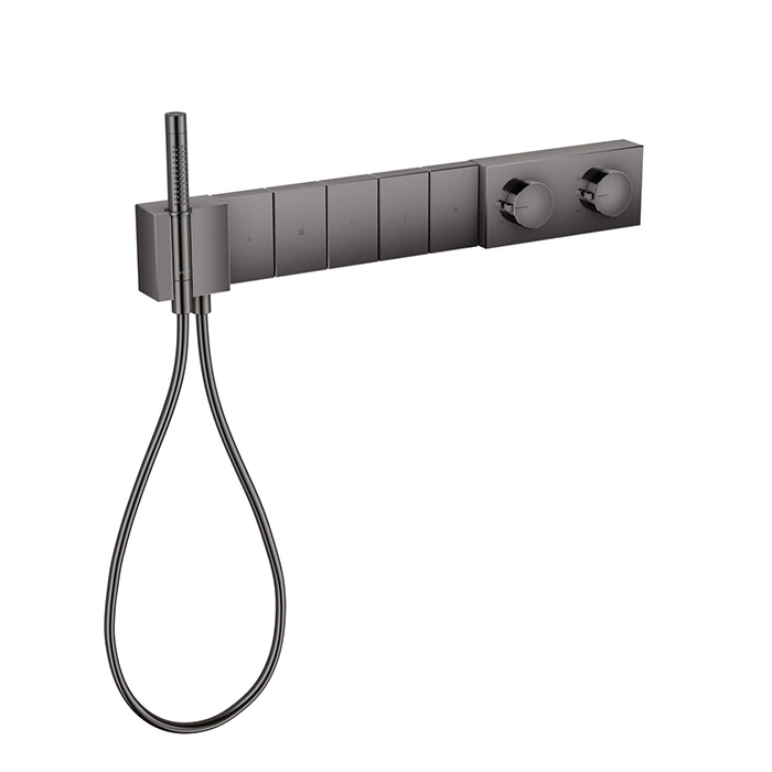 Термостат AX Edge 680/100 предлагает расширенные возможности для гидромассажа. Комплект включает пять насадок для верхнего душа, обеспечивающих равномерное распределение струй. Гибкий шланг с ручной лейкой позволяет направлять воду в нужную зону.