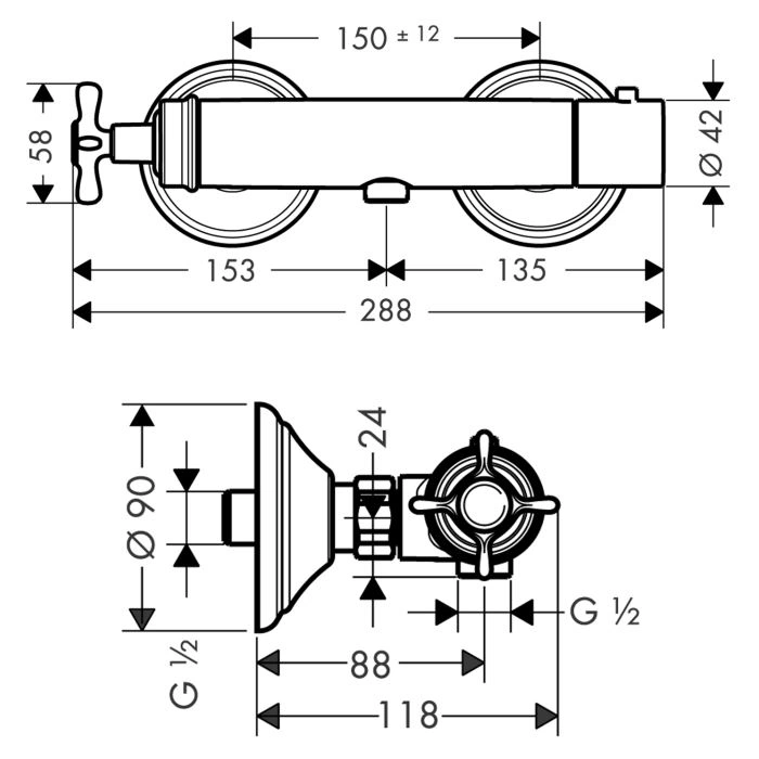 Монтаж термостата AX Montreux стандартен для настенных систем. Для корректной работы требуется подключение к горячей и холодной воде с рекомендуемым давлением. Встроенный фильтр грубой очистки защищает механизм от мелких частиц.