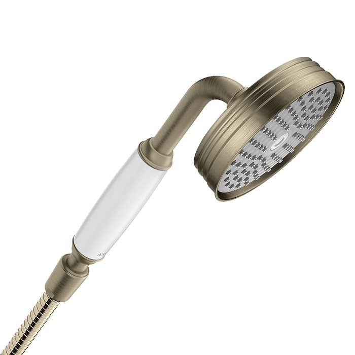 Ручной душ AX Montreux изготовлен из высококачественной латуни с покрытием "шлифованный никель", а рукоятка выполнена из прочного белого пластика. Такое сочетание обеспечивает долговечность, стойкость к коррозии и привлекательный внешний вид.