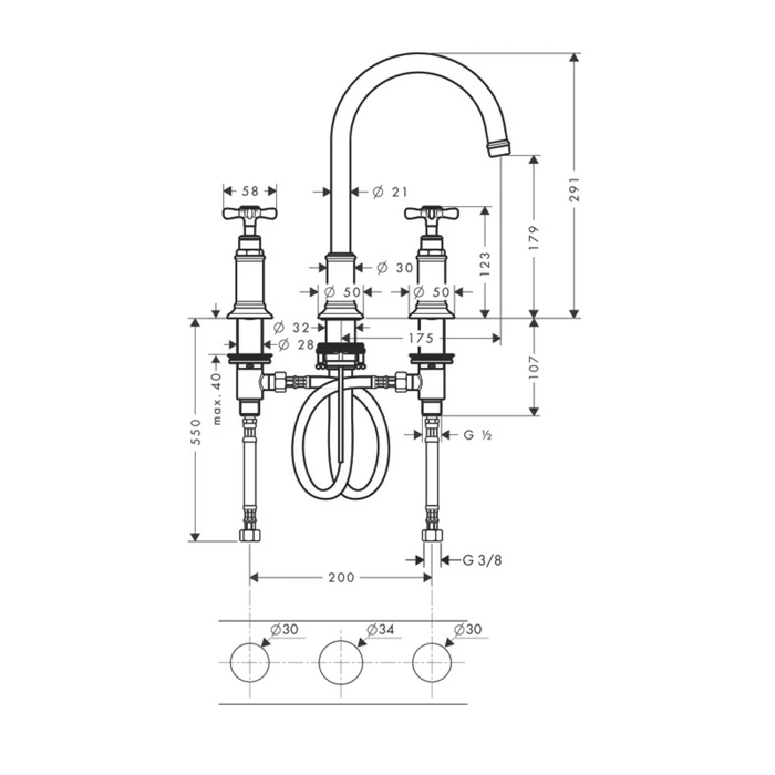 Классическая трёхкомпонентная компоновка не теряет актуальности благодаря эргономике и ремонтопригодности. Модель Montreux создана для монтажа в стандартные отверстия на раковине или столешнице.