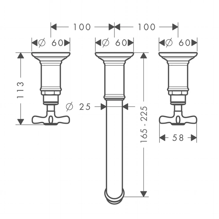 Излив смесителя имеет вылет 165 мм от стены, а его общая длина составляет 225 мм. Высота излива является фиксированной и не регулируется, что обеспечивает стабильную и надежную конструкцию.