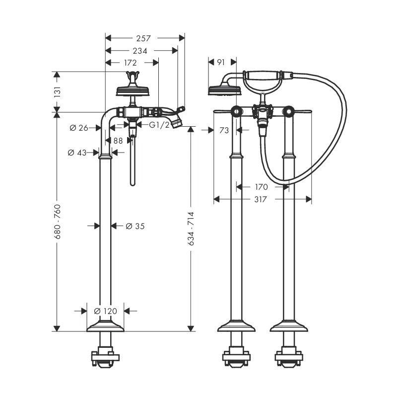 Перед покупкой напольного смесителя тщательно измерьте планируемое место установки. Учитывайте не только высоту излива и возможность подвода скрытых коммуникаций, но и длину шланга ручного душа. Для комфортного использования душем, его шланг должен без натяжения доставать до всех уголков ванны и, при необходимости, до раковины. Модель AX Montreux имеет стандартную длину, но всегда проверяйте этот параметр в описании товара.