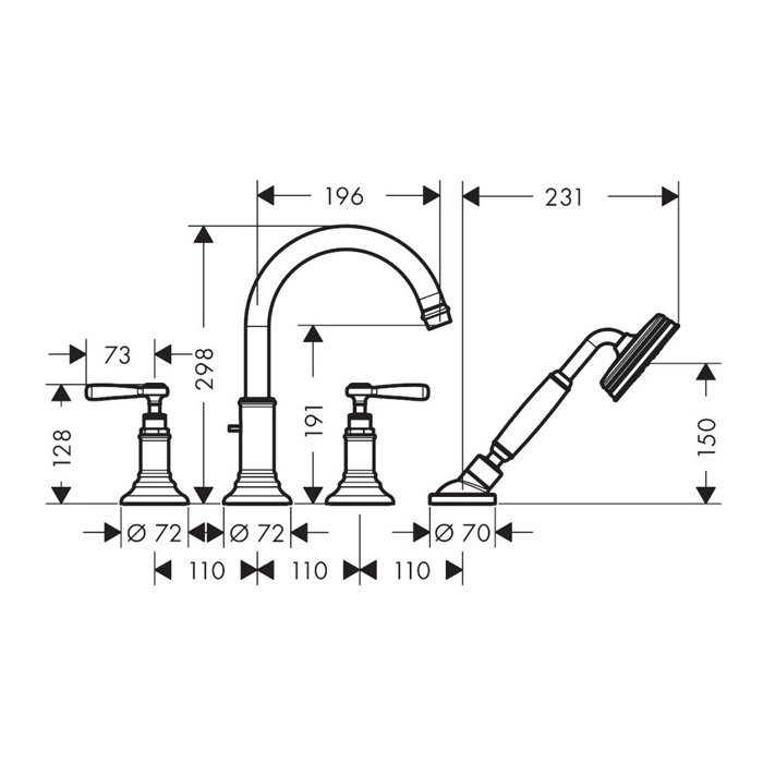 В комплект входит: смесительный узел с рычажными рукоятками, излив, ручной душ с душевой струей, лейка для душа на кронштейне, необходимые соединительные шланги и крепежные элементы для установки в 4 отверстия на борту ванны или столешнице.