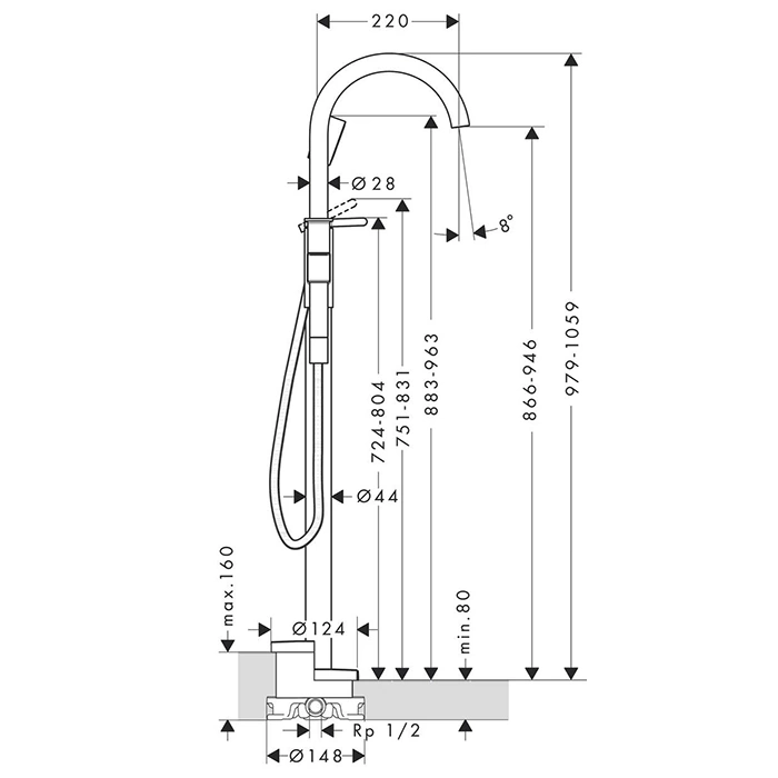 Смеситель AX One монтируется на пол рядом с ванной. Для установки требуется подводка водопроводных труб и слива под напольное покрытие. Рекомендуем доверить монтаж профессиональному сантехнику для обеспечения надежности и герметичности соединений.