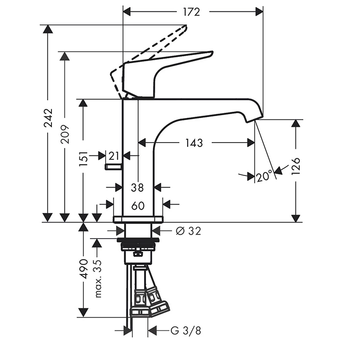 Излив длиной 143 мм оптимален для большинства стандартных раковин. Он обеспечивает достаточный вынос для комфортного мытья рук и наполнения посуды. Комплектация включает донный клапан - важный элемент для современной мойки. Он позволяет быстро перекрыть сливное отверстие, что необходимо для набора воды.