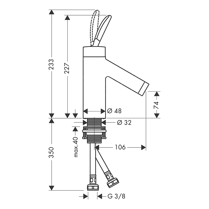 Данная модель предназначена для установки на раковину или столешницу (монтаж на одно отверстие). Стандартное межосевое расстояние для подключения подводки - не требуется, так как это монокомандный смеситель с одним крепежным отверстием.