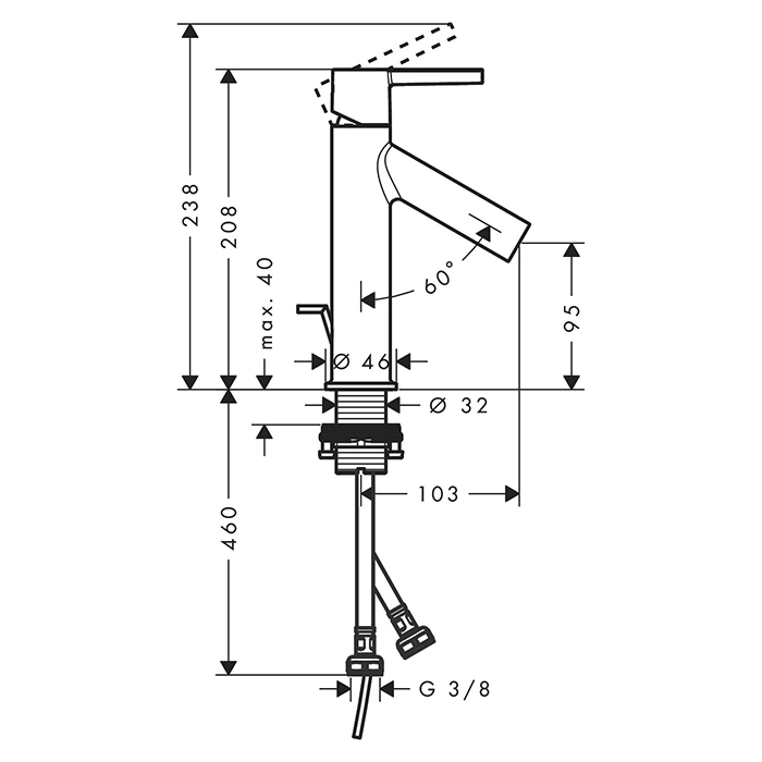 Высота излива составляет около 130 мм. Смеситель имеет однорычажное управление, аэратор для экономии воды и стандартное межосевое расстояние для подключения 100 мм. Подходит для большинства раковин с одним или тремя монтажными отверстиями.