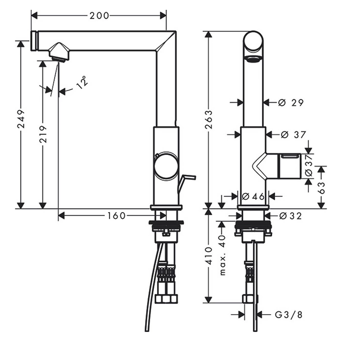 Модель AX Uno 200 с изливом 160 мм предназначена для установки в одно отверстие на стандартных раковинах для ванной комнаты или кухонных мойках с соответствующей посадочной дистанцией.