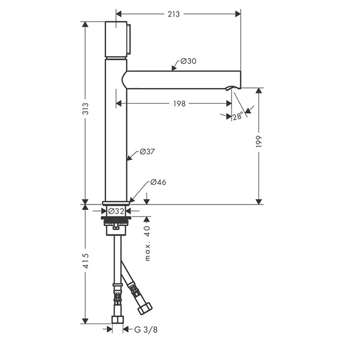 Длина излива (вылет от центра смесителя) составляет 200 мм. Это универсальный размер, который подходит для большинства раковин, обеспечивая комфортное использование и предотвращая разбрызгивание.