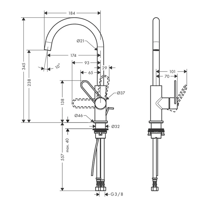 Модель AX Uno оснащена одной рукояткой, которая управляет и напором, и температурой воды. Это максимально удобно, когда ваши руки заняты. В основе устройства — надежная керамическая картриджная система. Она обеспечивает плавный ход рычага, точную регулировку и защиту от протечек. Излив высокий и поворотный, что позволяет легко наполнять крупную посуду или умываться.