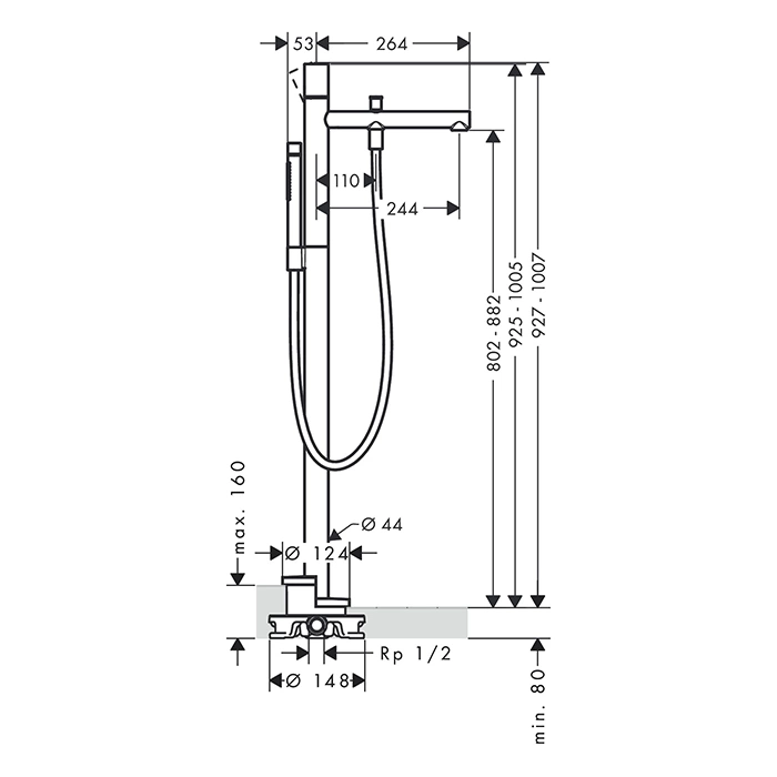 Данная модель предназначена для напольного монтажа. Смеситель устанавливается отдельно от ванны на полу, требуя подвода коммуникаций через пол. Это дизайнерское решение, которое визуально облегчает пространство вокруг ванны.