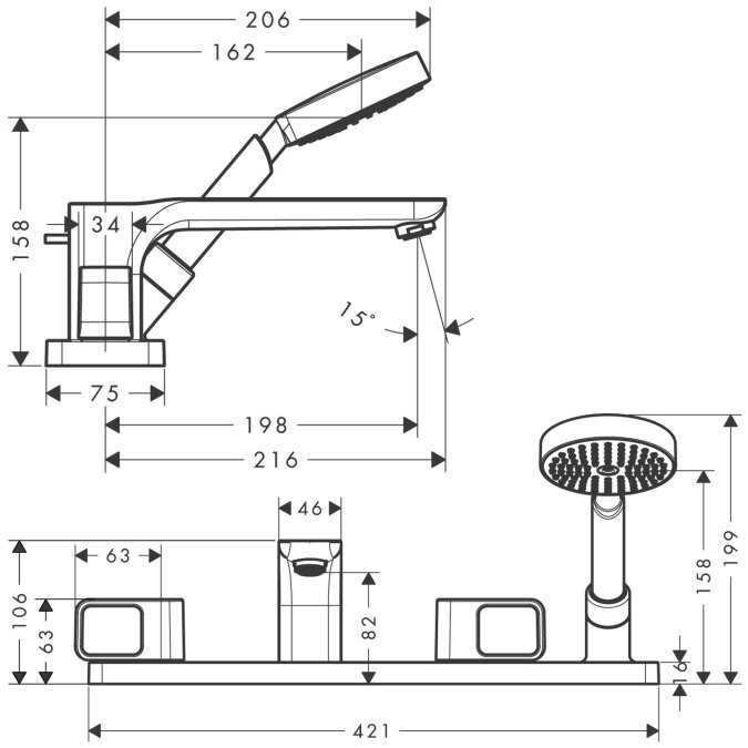 Модель предназначена для установки на ванну или бортик ванны с четырьмя посадочными отверстиями. Стандартное межосевое расстояние для излива и ручек обычно составляет 200 мм, но рекомендуем уточнить параметры вашей ванны и сравнить с техническими характеристиками изделия перед покупкой.