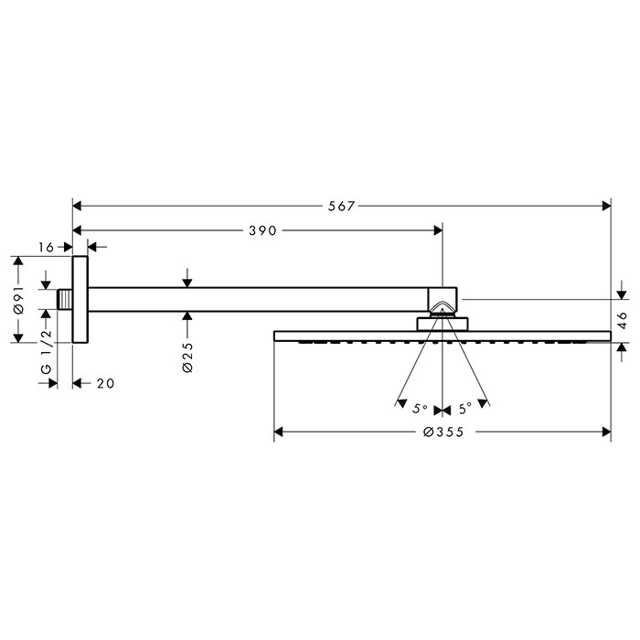 Диаметр лейки душа составляет 350 мм. Длина держателя (штанги) для крепления составляет 390 мм. Эти размеры важно учитывать для планирования места установки.