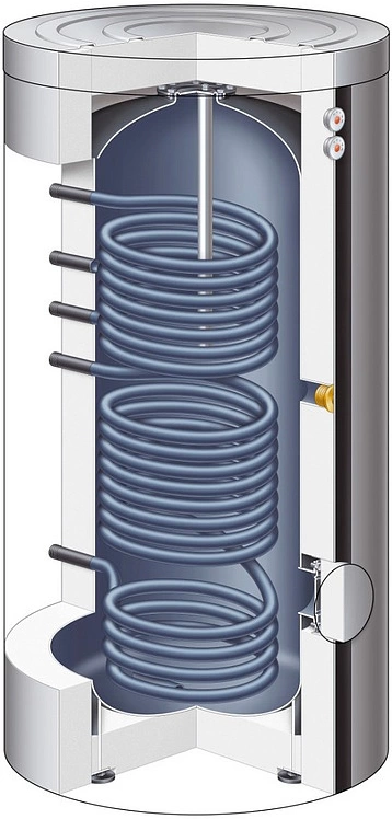 - Двойной змеевик из нержавеющей стали: нижний контур для подключения солнечных коллекторов, верхний — для интеграции с котлом отопления