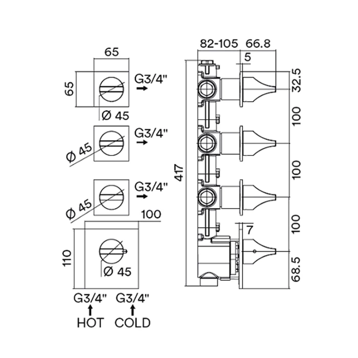 Модель APICE оснащена тремя запорными вентилями. Два из них отвечают за раздельное включение верхнего лейки душа и нижнего излива (или ручного душа). Третий вентиль - это термостатическая ручка, которой вы задаете нужную температуру. Также смеситель имеет кнопку безопасной блокировки от случайного изменения температуры (обычно при +38°C) и возможность ограничения максимальной температуры.