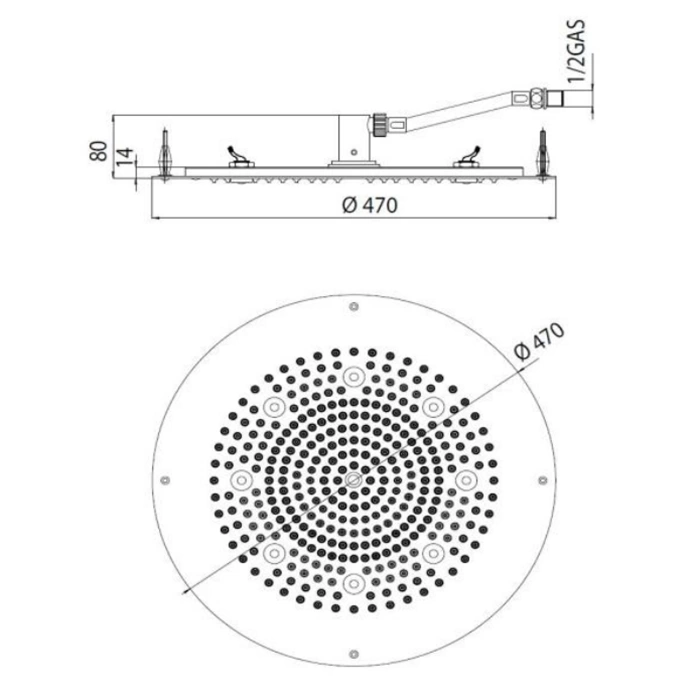 Диаметр лейки душа составляет 470 мм. Для монтажа используется стандартное крепление на штангу (вертикальную трубу) диаметром 18-26 мм, что делает модель совместимой с большинством душевых систем.