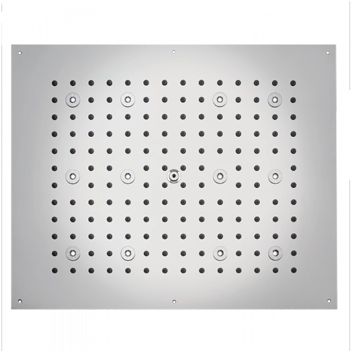 Панель формата 570x470 мм изготовлена из высококачественной нержавеющей стали AISI 304, что гарантирует устойчивость к коррозии и долговечность. Прямоугольная форма и матовая поверхность органично вписываются в любые интерьерные решения - от классики до хай-тека. Встроенный светодиодный модуль является неотъемлемой частью конструкции, обеспечивая равномерную подсветку водяных струй.