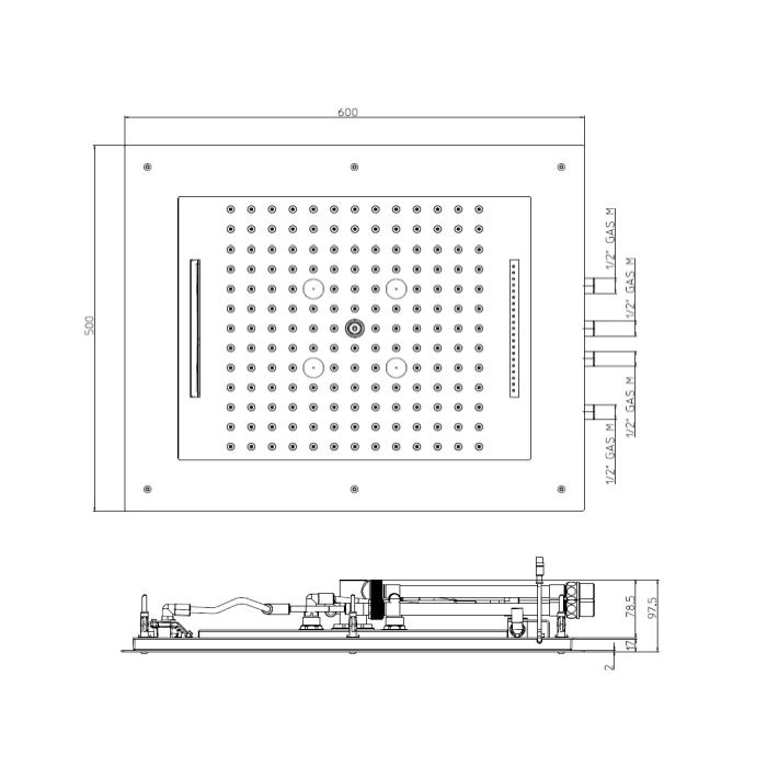 В комплект входит: верхний душ (лоток) с системой переключения режимов, LED-панель для хромотерапии, монтажный короб, декоративная панель, гибкие подводы для воды (1/2"), комплект крепления и уплотнителей. Смеситель, термостат или система управления приобретаются отдельно, что позволяет интегрировать душ в любую сантехническую концепцию.