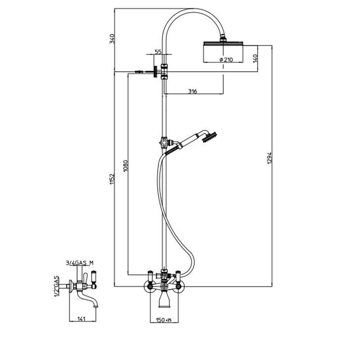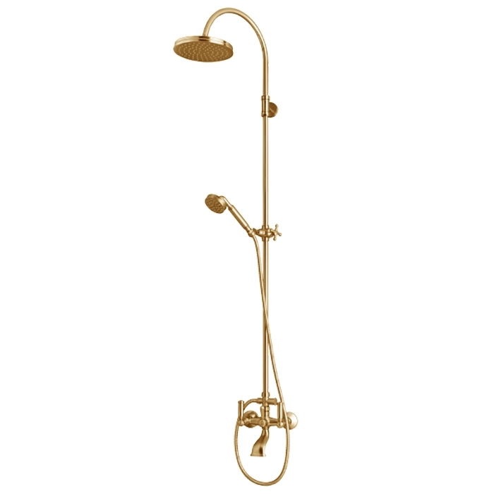 Основой служит латунная штанга с телескопической регулировкой, позволяющая установить верхний душ на высоте от 1,2 до 1,8 метра. Оба излива - верхний и ручной - изготовлены из латуни и имеют стойкое PVD-покрытие золотого цвета, устойчивое к износу и воздействию влаги.