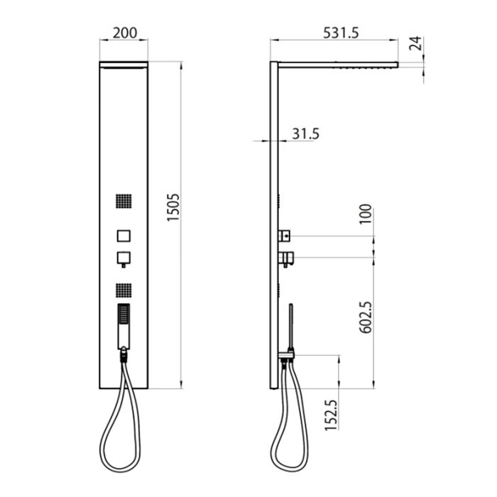 В комплект входят сама душевая панель со встроенным термостатическим смесителем, верхний лейка-дождь, ручной душ со штангой и креплением, боковые гидромассажные форсунки, нижний излив и необходимый набор крепежных элементов. Шланги и декоративные элементы также присутствуют.