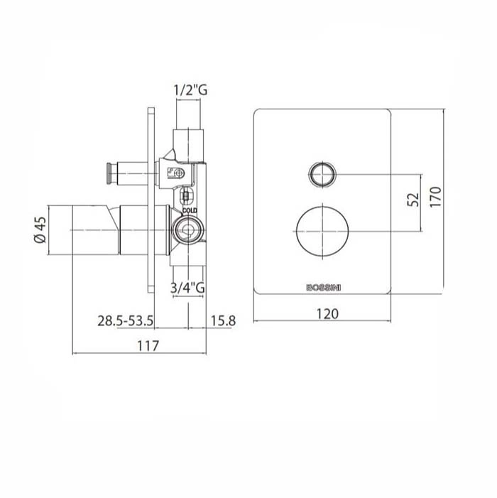 Смеситель Bossini Oki предназначен для встраиваемого (скрытого) монтажа в стену. Все рабочие механизмы и подводка устанавливаются в специальную монтажную коробку в стене, снаружи остаются только настенная накладка (панель) и ручка-кнопка управления.