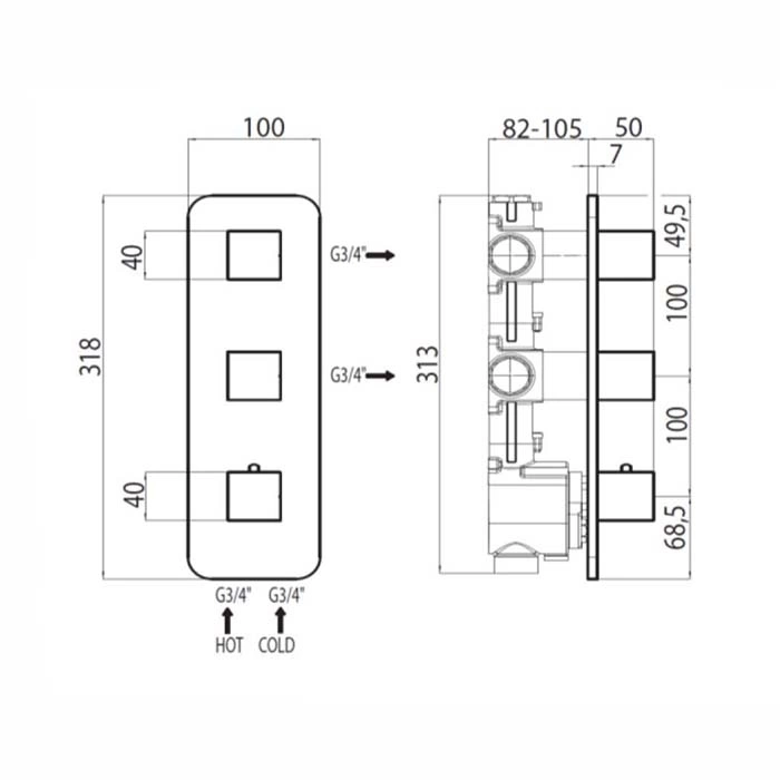 Встречная часть термостата Bossini с 2 запорными клапанами и выходами для вертикального/горизонтального монтажа (Z030201000)