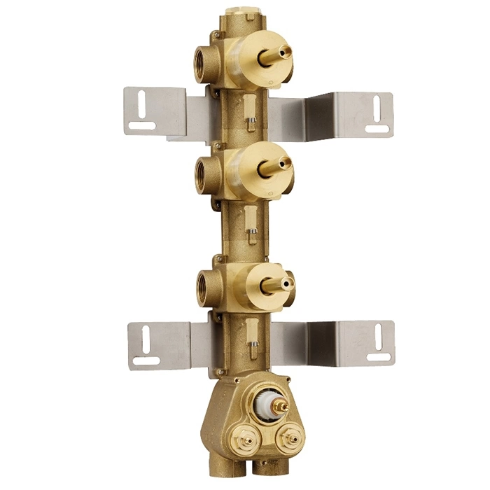 В базовый комплект, как правило, входят: термостатический картридж (основной механизм), лицевая панель с рукояткой регулировки температуры, два делителя (тройника) на 5 выходов, установочная рамка (суппорт) и набор крепежных элементов. Запорный клапан обычно является интегрированной частью корпуса. Для монтажа потребуются подводящие трубки (шланги), которые часто приобретаются отдельно.
