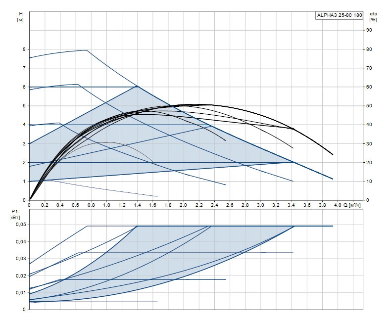 Модель ALPHA3 25-80 180 работает в трех фиксированных режимах скорости и прецизионном режиме пропорционального давления. Ее максимальная производительность достигает 4.8 м³/ч, а напор - до 8 метров водяного столба, что достаточно для большинства двухэтажных коттеджей.