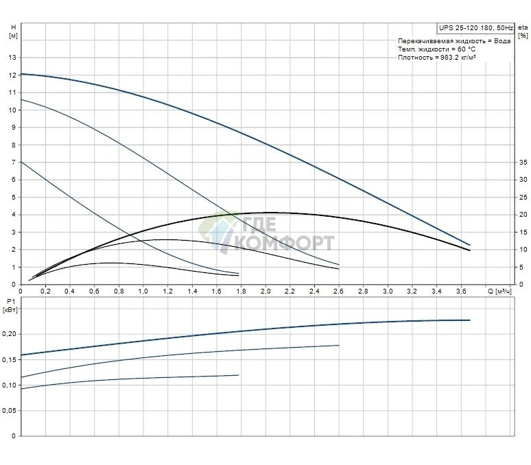 Насос обеспечивает максимальный напор до 12 метров водяного столба и пропускную способность до 3,5 куб. м/ч. Мощность двигателя регулируется в диапазоне от 25 до 70 Вт в зависимости от выбранной скорости, что позволяет существенно экономить электроэнергию по сравнению с односкоростными аналогами. Модель относится к классу энергоэффективности А.