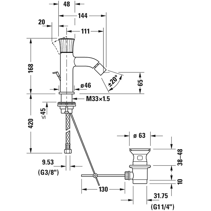 Смеситель для биде Duravit White Tulip: 1 отверстие, донный клапан, хром (WT2400001010)