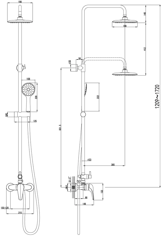 - Регулируемый по высоте верхний душ.