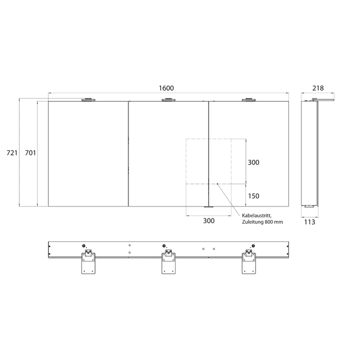 Ширина шкафа 1600 мм позволяет с комфортом разместить его даже над двойной раковиной. Три зеркальные дверцы открывают доступ к просторной внутренней полке, где удобно хранить все необходимые принадлежности для ванной: