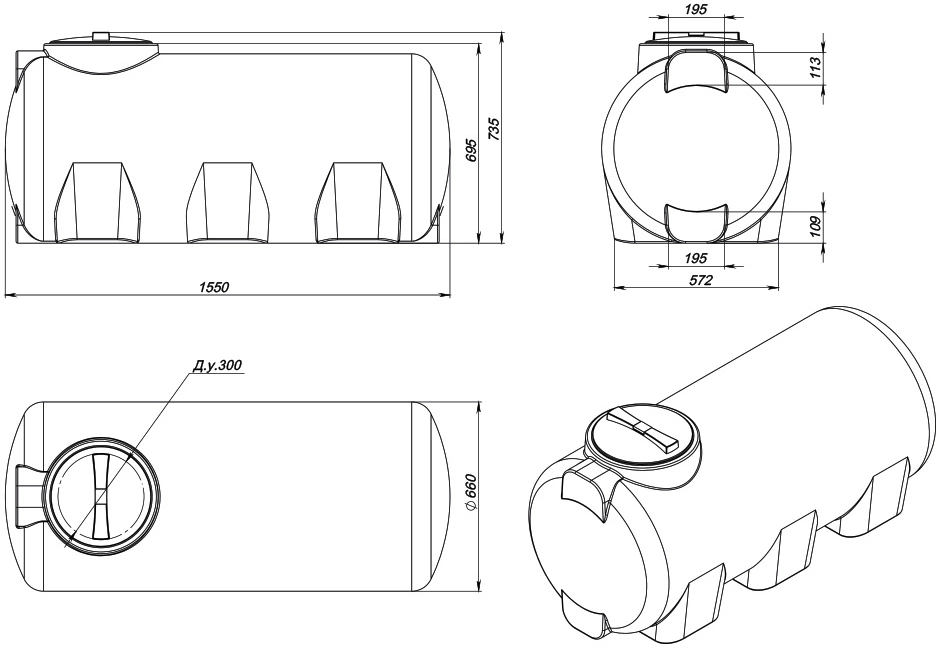 - Прочная цилиндрическая форма с ребрами жесткости. Конструкция устойчива к внешним нагрузкам и деформации, что важно при складировании или транспортировке. Резервуар сохраняет геометрию и целостность даже при полной загрузке.