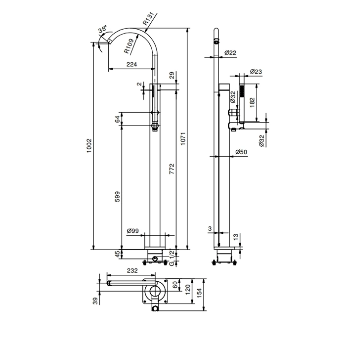 Модель AA/27 предназначена для установки на пол рядом с ванной. Подводка воды осуществляется гибкой подводкой или жесткими трубками через пол. Такой тип установки минимизирует строительные работы и дает архитектурную выразительность. Смеситель совместим со стандартными системами водоснабжения.