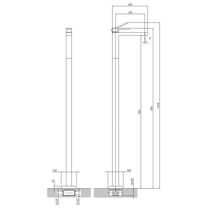Смеситель монтируется на полу рядом с раковиной или ванной. Крепежная стойка фиксируется к полу через специальную монтажную пластину. Подвод воды (гибкие шланги или жесткая подводка) и слив организуются скрыто, под напольным покрытием, что требует планирования на этапе черновых работ. Рекомендуем доверить установку профессиональному сантехнику.