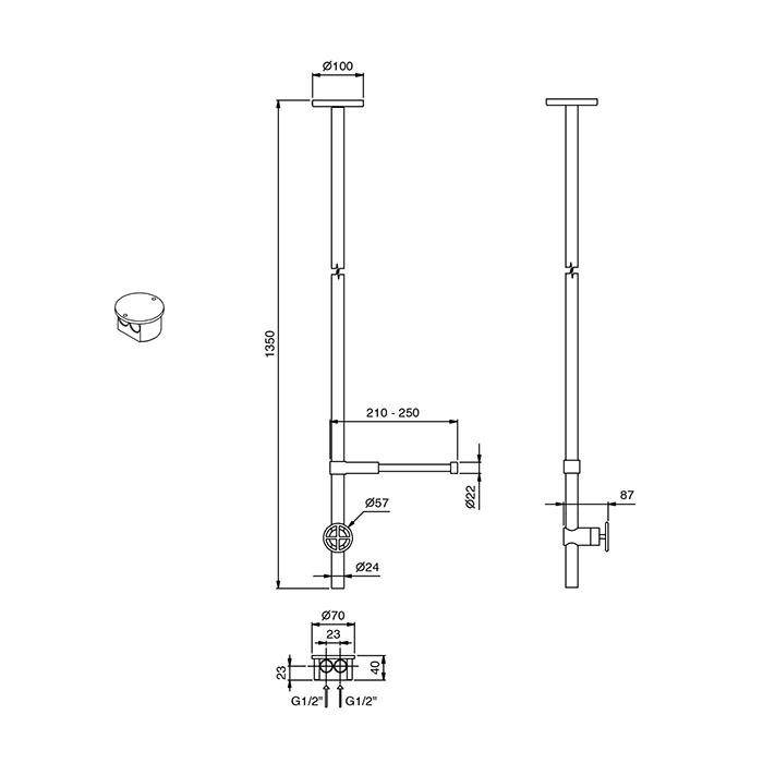 Длинный излив (1350 мм) обеспечивает большую зону использования, но создает значительный рычаг. Крепление к потолку должно быть выполнено в капитальную конструкцию (бетонное перекрытие или мощный металлический каркас) с использованием специальных дюбелей или анкерных болтов. Крепление к гипсокартонному потолку без усиления места установки недопустимо.