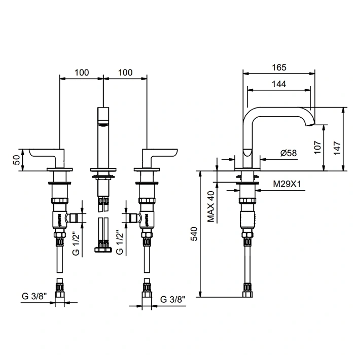 В стандартный комплект, как правило, входят: сам смеситель с изливом, две ручки, внутренний картридж, крепежные шпильки (штанги), декоративные чашки (накладки) для закрытия монтажных отверстий, уплотнительные прокладки и иногда гибкая подводка. Для точного монтажа рекомендуется использовать профессиональную установку. Состав комплекта может незначительно меняться - уточняйте перед покупкой.