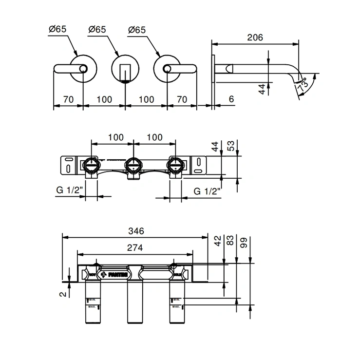 Смеситель предназначен для монтажа в три отверстия со стандартным межосевым расстоянием 102 мм (от центра до центра). Точные габаритные размеры излива и высоту конструкции рекомендуется уточнять в техническом описании товара или у консультанта.