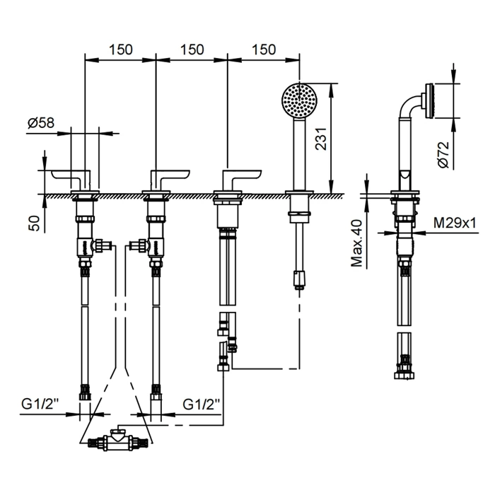 - Комплектация: основной смеситель, ручной душ, душевой шланг, эксцентрики и необходимый крепёж.